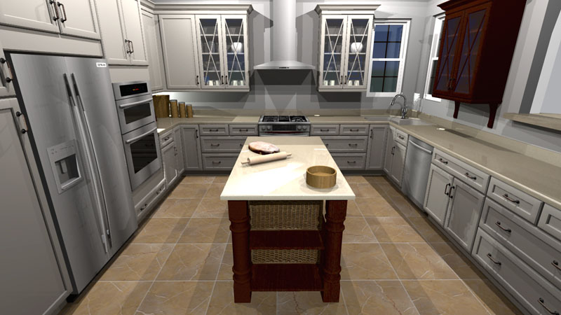 Kitchen design by Kraftmaid Cabinetry for Green Builder Magazine's IBS 2011 ReVision Show Home. This SketchUp model includes Dynamic Components of Kraftmaid cabinets in Atwater door style in Maple Canvas Paint finish with Aged Bronze Pulls (SKU 7035). All the cabinets are Atwater door style, except for cabinets that include a classic mullion glass insert. The oven cabinet is a new cabinet type called Tall Oven Cabinet double. One of the wall cabinets is a Marquette door style in Cherry Peppercorn finish.